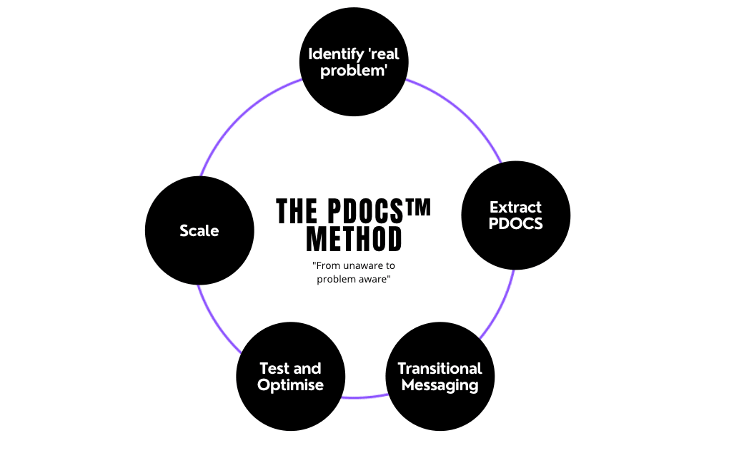 We do this through an acronym called ‘P.D.O.C.S’ which is like a filter we use to uncover current pains, desires, obstacles common beliefs and steroids